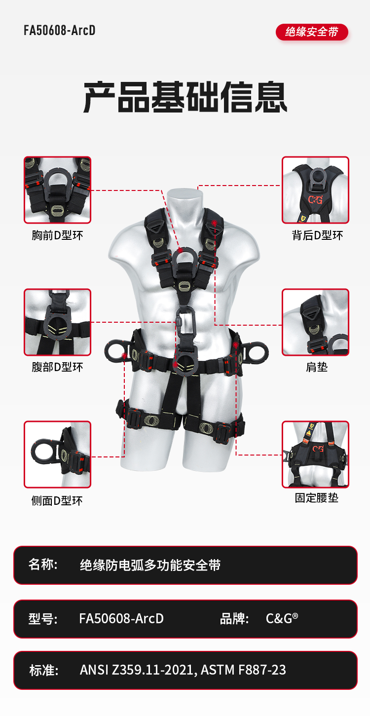 1、5個掛點(diǎn):后背1個,胸前1個,腰部2個,腹部1個 2、6個調(diào)節(jié)點(diǎn):腰、肩、腿 3、織帶材質(zhì):芳綸+合成纖維 4、五金件:合金鋼+絕緣復(fù)合層 5、調(diào)節(jié)扣:口日字 6、帶護(hù)腰 7、標(biāo)準(zhǔn):GB6095-2021 8、適用:區(qū)域限制、圍桿作業(yè)、墜落懸掛