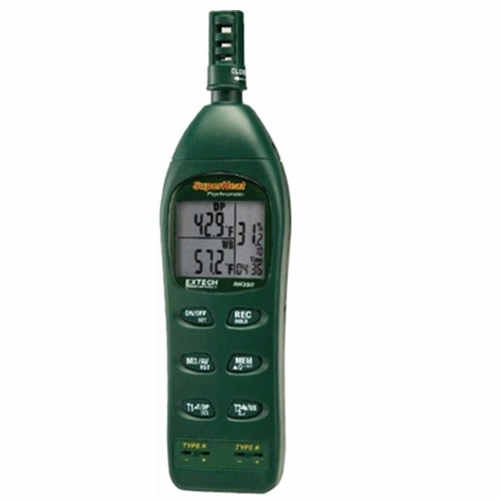 配有兩個過熱環(huán)境用K型外部探針輸入和存儲器; 過熱溫差測量:T1-T2、空氣-T1、和T1露點(diǎn)溫度; 背光LCD顯示3個參數(shù):%RH和溫度以及露點(diǎn)溫度、濕球溫度或者K型溫度; RS2